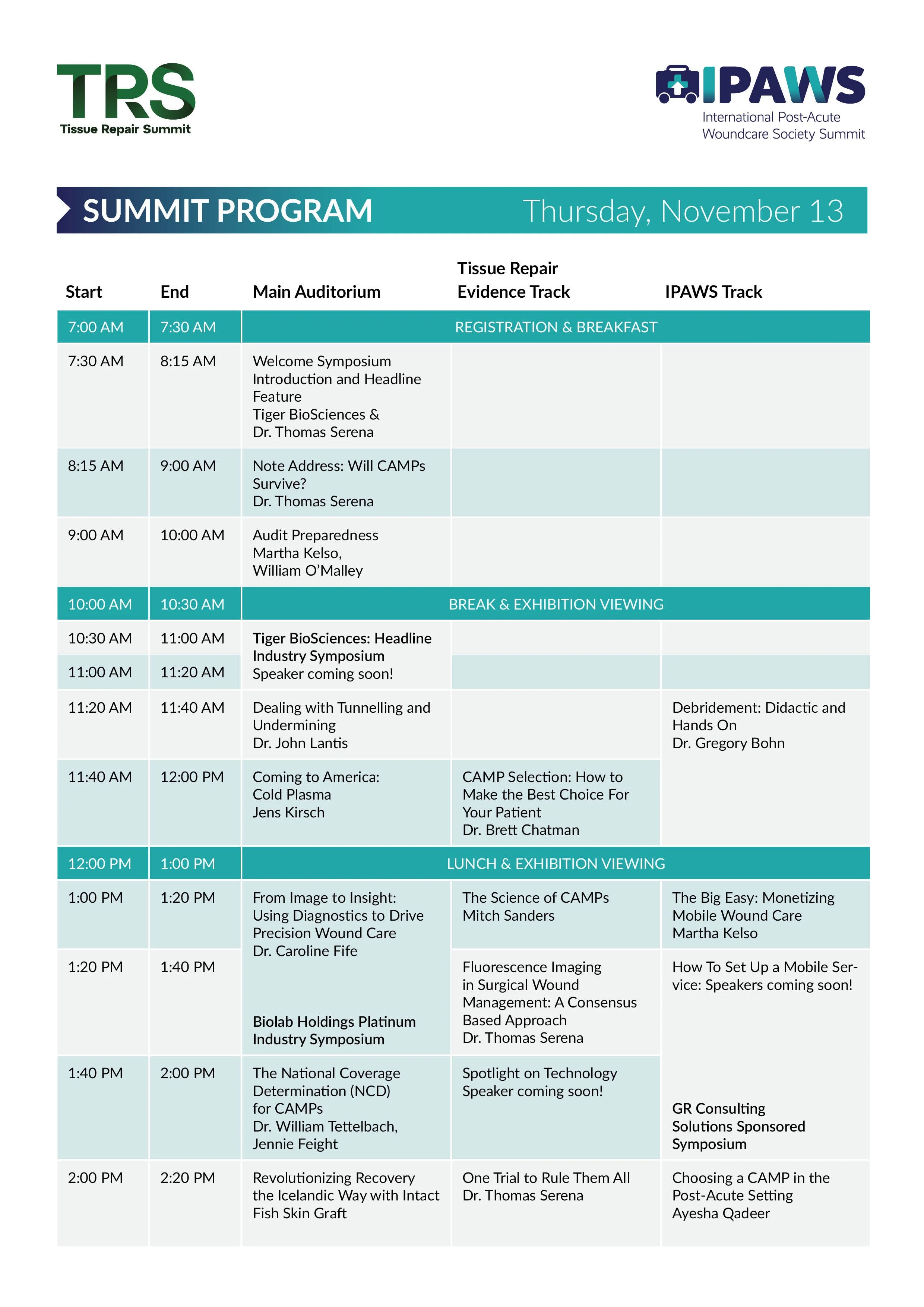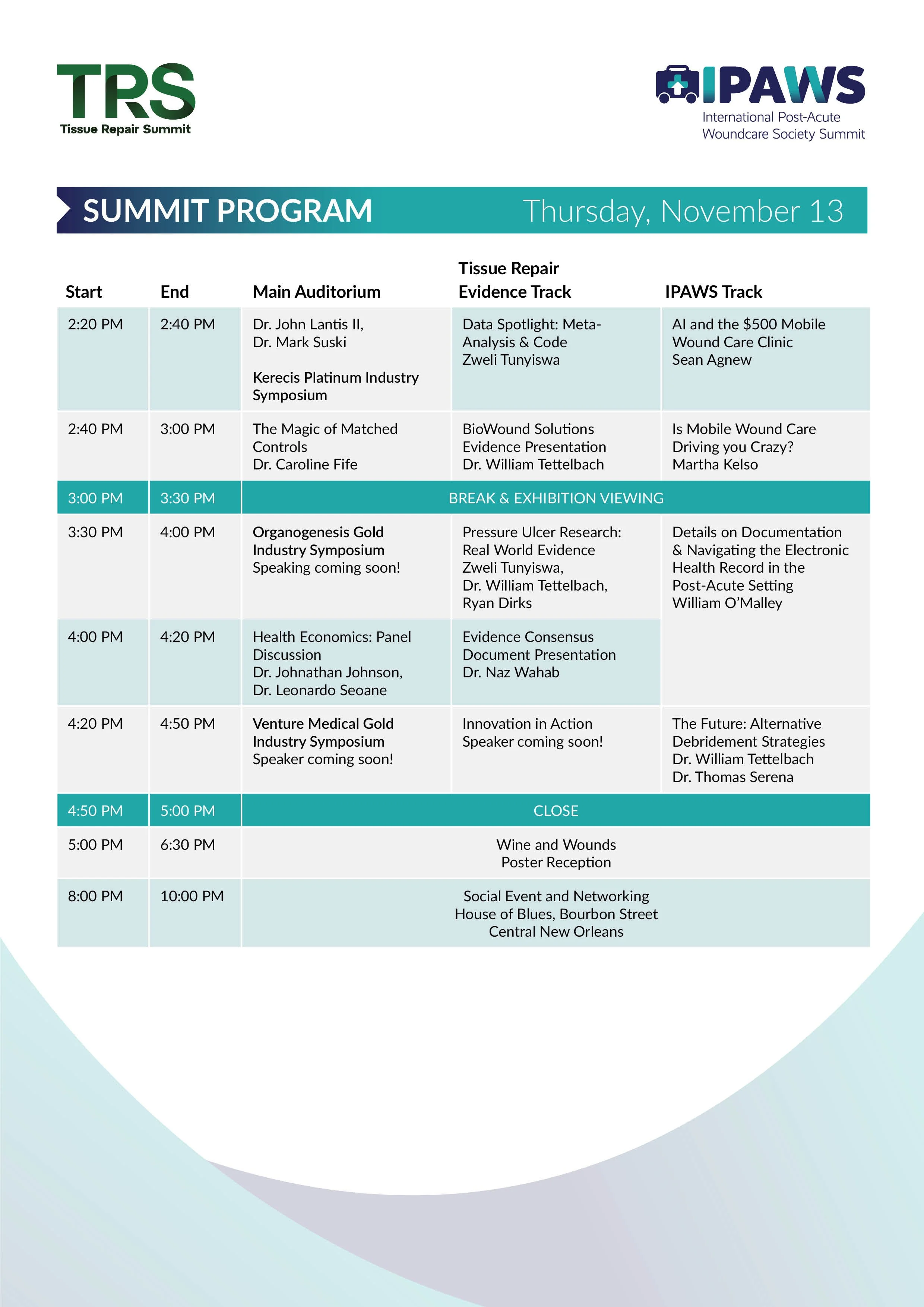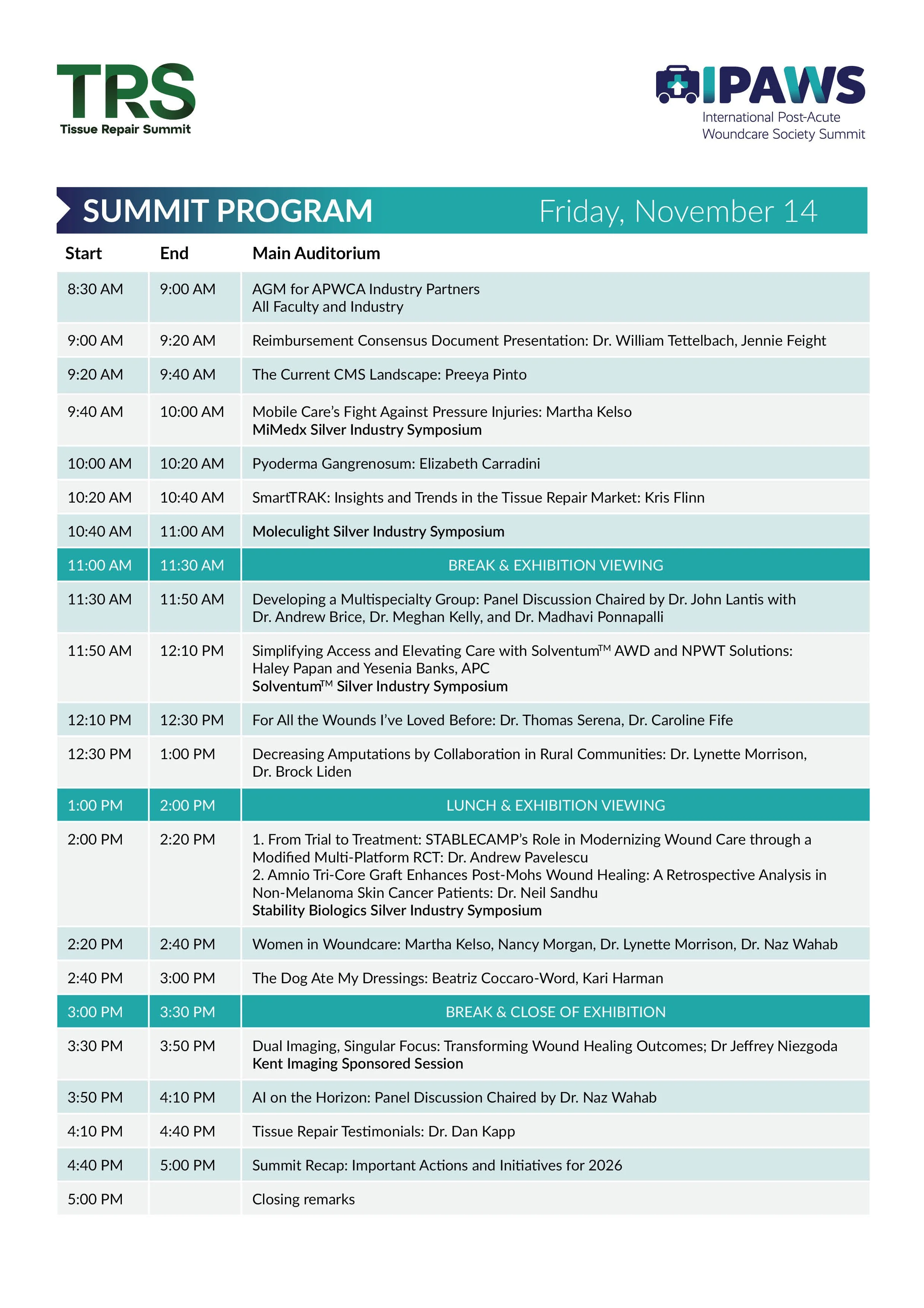 The International Post-Acute Wound Care Society & Tissue Repair Summit 2025 spans two days (November 13–14, 2025), with a welcome event the evening of Tuesday, November 12. The comprehensive program is structured into three dedicated tracks, offering a focused perspective on tissue repair, ensuring that attendees gain deep insights into their areas of interest. Sessions run in parallel across these tracks, and all participants are free to move between them - allowing you to tailor your summit experience by choosing the talks and workshops most relevant to your practice.